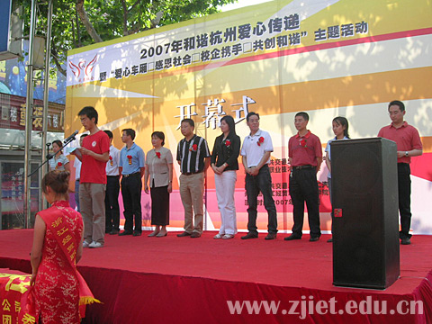5月22日下午,我院与杭州市公共交通总公司第二汽车公司团委联合在杭州龙翔公交中心站隆重举行了“爱心车厢 感恩社会 校企携手 共创和谐”主题活动开幕式。