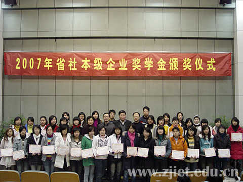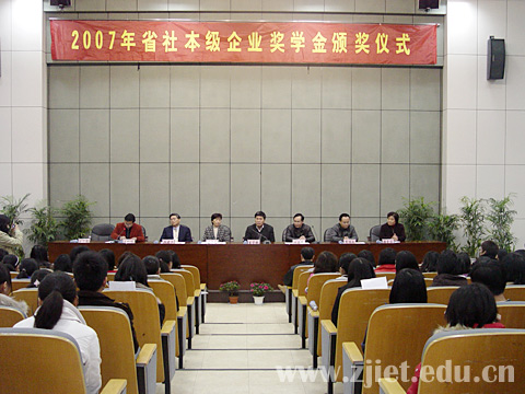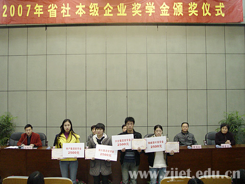 12月18日下午,2007年省社本级企业奖学金颁奖仪式在图书馆报告厅隆重举行。出席颁奖仪式的领导有浙江兴合集团副总裁何忠民、浙江新大集团党委副书记褚月红、浙江茶叶集团党委副书记副总经理黄国松、浙江特产集团副总经理郑建平、学院党委书记童学敏、党委副书记潘素芳。出席仪式的还有四大集团和学院相关部门的领导。仪式由学院学生处副处长吴刚群主持。