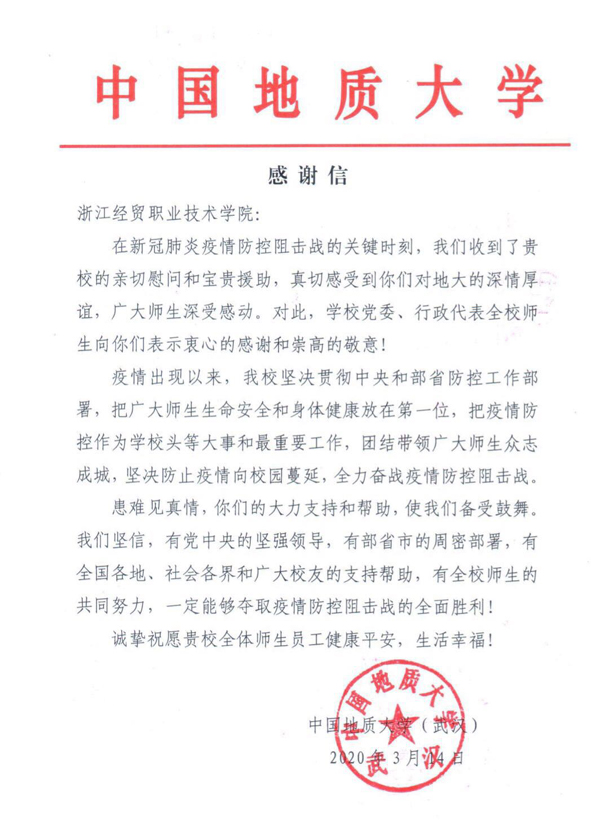 近日,中国质地大学(武汉)向我校发来感谢信,对我校在该校遭受新冠病毒疫情侵袭的关键时刻伸出援手、共同抗击疫情表示感谢,同时也表达了两校同舟共济、共克时艰,携手打赢疫情防控阻击战的信心和决心。