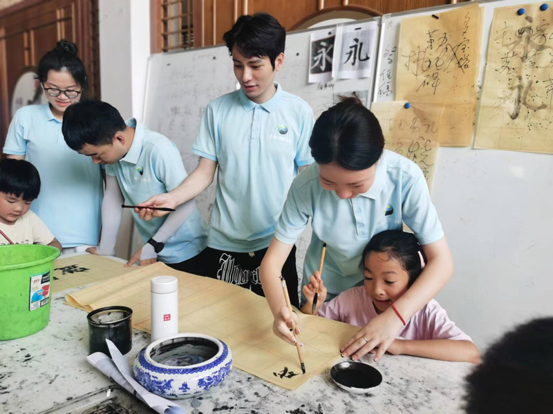作为浙江省书法特色村,南山村每年暑假都会组织学生参加书法培训,陶冶情操、传承文明。实践队员们也参与到培训中,辅助当地书法家开展书法授课,并为孩子们讲述了古代书法家的艺术之旅,让孩子们感受到传统文化魅力,给孩子们带去更多陪伴与温暖。