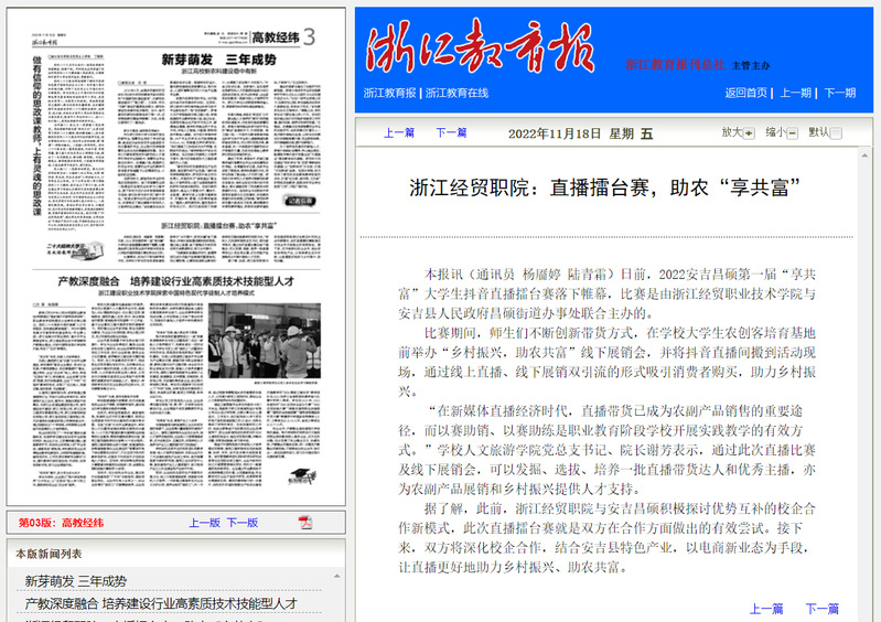 据了解,此前,浙江经贸职院与安吉昌硕积极探讨优势互补的校企合作新模式,此次直播擂台赛就是双方在合作方面做出的有效尝试。接下来,双方将深化校企合作,结合安吉县特色产业,以电商新业态为手段,让直播更好地助力乡村振兴、助农共富。