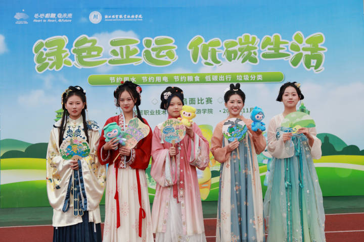 扇面书画是中国书画艺术中的一种创意之作,幅不盈尺的扇面传递着中华民族的历史文化信息。活动中,部分同学身穿代表杭州南宋的宋服,精致妆容清丽脱俗。“我的作品融合了杭州西湖、亚运、绿色等元素,利用团扇载体,借助绘画手段对杭州亚运会的憧憬表现出来。”会展策划与管理213班李梦佳表示,要广泛学习绿色低碳相关知识,提升自己的生态文明素养,养成低碳生活的好习惯,做好绿色亚运的传播者、实践者和推动者。