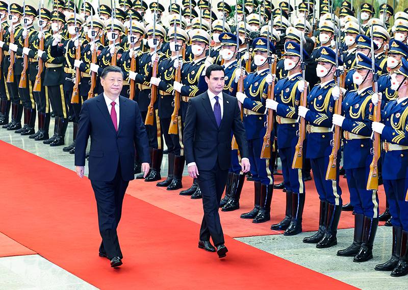 1月6日,国家主席习近平在北京人民大会堂同来华进行国事访问的土库曼斯坦总统谢尔达尔・别尔德穆哈梅多夫举行会谈。这是会谈前,习近平在人民大会堂北大厅为谢尔达尔・别尔德穆哈梅多夫举行欢迎仪式。新华社记者 姚大伟 摄
